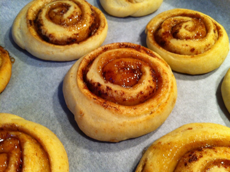 Die Zimtschnecken im vorgeheizten Ofen bei 200° C (Ober- Unterhitze) ca. 15 Minuten goldbraun backen.