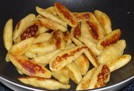 Zu der Kartoffelpampe wird eine Prise Salz, das Ei und das Mehl hinzugegeben. Alles zu einem geschmeidigen Kartoffelteig verarbeiten. Die Hände leicht feucht machen (es empfiehlt sich eine Schüssel mit kaltem Wasser neben den Teig zu stellen. Man muss die Hände immer wieder anfeuchten) und kleine Rollen formen.