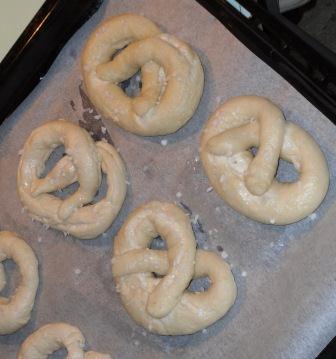 Nun werden sie mit grobem Salz (Alternativ-Varianten wären mit Käse, mit Kürbiskernen oder auch mit Sonnenblumen-Kernen) bestreut. Das Blech in den auf 220 Grad C vorgeheizten Ofen schieben. 25 Minuten backen, bis sie die typische Mahagoni-Farbe angenommen haben.