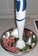 Den Blattspinat über Nacht im Kühlschrank auftauen. Die Hälfte des Spinates in eine Schüssel geben. Die Zwiebel und den Knoblauch schälen und grob klein schneiden und zu dem Spinat geben. Das Schnitzel ebenfalls klein schneiden und hinzugeben. Von der heiß gewaschenen, und mit einem sauberen Tuch abgeriebenen Zitrone werden die Zesten heruntergeschält.