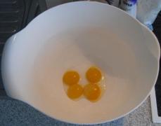 Die Eier trennen. Das Eiweiß in einer kleineren Schale ebenfalls zur Seite stellen.