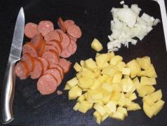 Sobald die Kartoffeln anfangen zu bräunen, wird die klein geschnittene Wurst mit in die Pfanne gegeben.