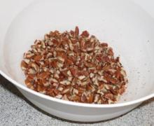 Für die Füllung wird die Zwiebel geschält und in kleine Würfel geschnitten. Etwas Öl in einem großen Topf erhitzen und die Zwiebeln darin andünsten. Die Chorizo-Wurst in kleine Würfel schneiden und mit in den Topf geben. Die Pekannüsse werden fein gehackt und ebenfalls mit in den Topf gegeben. Alles anrösten lassen und regelmäßig rühren.