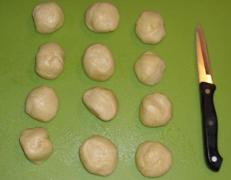 Aus Mehl, Salz und Butter einen geschmeidigen Teig kneten. Den Teig in zwei 2,5 Zentimeterbreite Rollen formen und diese in jeweils 6 gleichgroße Abschnitte aufteilen. Hieraus 6 Kugeln formen.