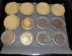 Die Tartelette-Formen leicht einfetten. Immer eine Kugel in die Mitte der Form legen und den Teig in der Form verteilen. Den Rand nach oben streichen, so dass das Kuchenförmchen gleichmäßig mit Teig gefüllt ist.