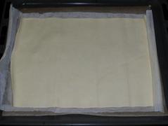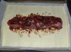 Den Blätterteig aufrollen. Den Teig mit der Hälfte, der Tomatenmischung bestreichen.