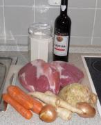 Das Gemüse um den Braten herum drapieren und die Kasserolle in den, auf 180° Grad Celsius vorgeheizten, Backofen schieben. Dort gart er insgesamt 1,5 Stunden. Er wird alle 15 Minuten übergossen. Die ersten zwei Male mit dem Rotwein und dann mit der Brühe, bis beides aufgebraucht ist.