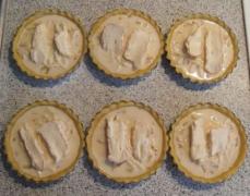 Die Tartelette-Förmchen mit etwas Butter einreiben. Den Teig in sechs gleichgroße Teile schneiden. Den Teig in die Tarteformen hineindrücken, so dass sie die ganze Form ausfüllen.