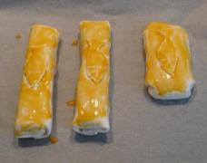 Die Lachspäckchen auf ein, mit Backpapier ausgelegtes Blech setzen. Hat man kleine Fische ausgeschnitten, so werden diese, ebenfalls mit Eiweiß bestrichen, auf den Päckchen angedrückt.