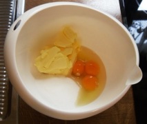 Die Eier mit Vanillezucker, Butter und dem Zucker schaumig rühren.