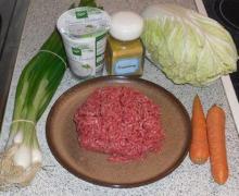 Die Karotten zu den Zwiebeln geben und etwa 3 Minuten andünsten. Das Hackfleisch ebenfalls hinzugeben.