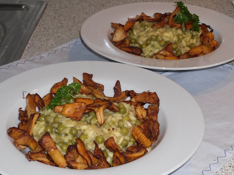 Was habe ich nun mit meinen Pfifferlingen getrieben? Ich habe ein veganes Erbsen-Haselnuss-Risotto zubereitet und dazu die gebratenen Pfifferlingen gereicht. Das Risotto schmeckt anders als mit Parmesan, aber durch die Nüsse erhält es ein sehr feines, individuelles Aroma!