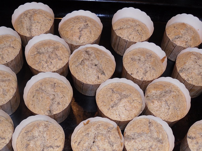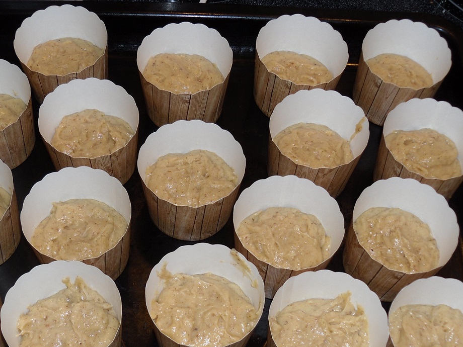 Den Teig gleichmäßig auf 18 Förmchen verteilen. Die Formen sollten nur zur Hälfte gefüllt werden, damit die Küchlein nicht zu hoch werden. Im vorgeheizten Backofen werden die Cupcakes bei 180° Grad Celsius (Unter- Oberhitze) für 28-30 Minuten goldgelb gebacken.