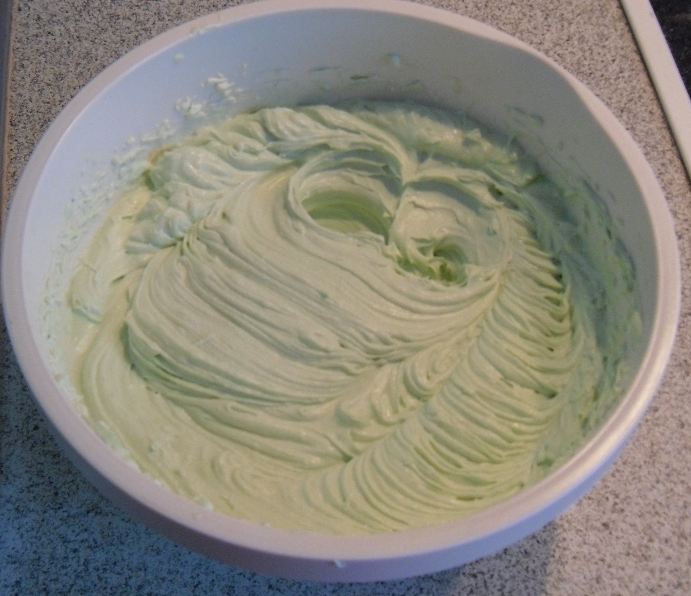 Die Tortencreme nach Packungsangabe mit dem Pulver, grüner Lebensmittelfarbe und Haferdrink oder Milch zubereiten.