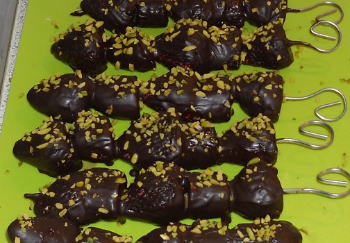 Die Schokolade muss vollständig erkalten. Das dauert etwa 3 Stunden. Man kann die Spieße auch in den Kühlschrank stellen, damit sie aushärten.