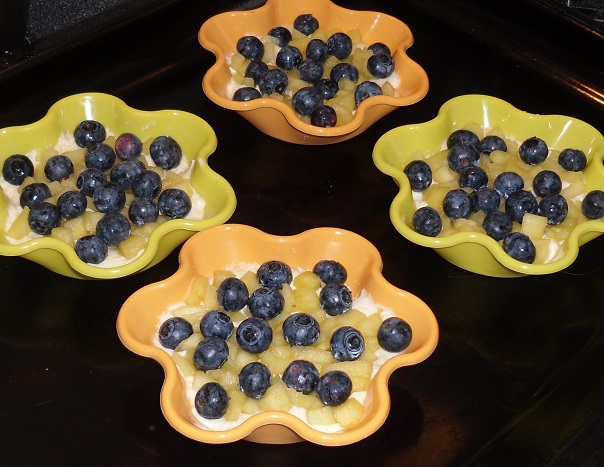 Die Apfelstückchen und die gewaschenen Heidelbeeren auf dem Teig verteilen.