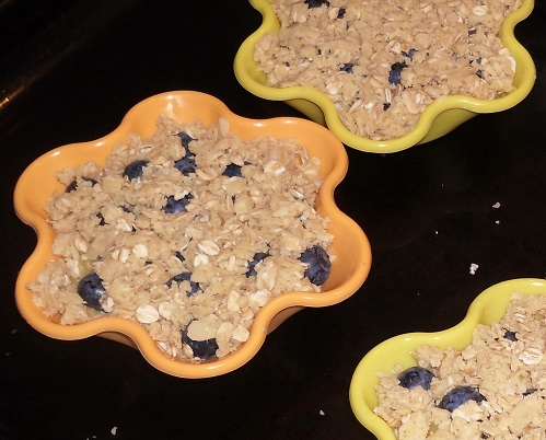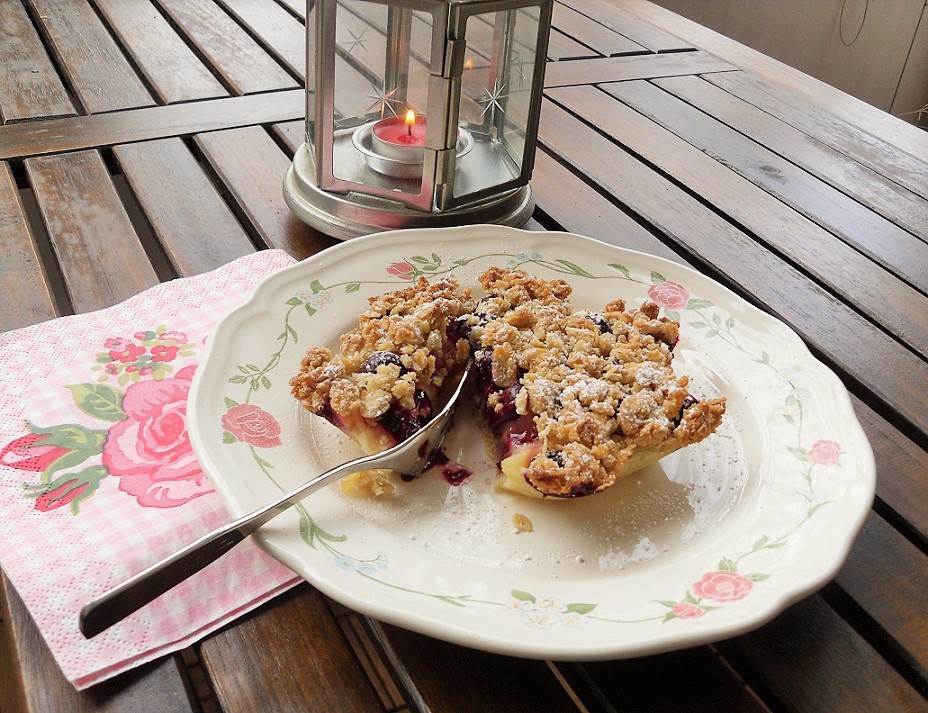 Anschließend den Mandel-Mürbteig über den Äpfeln und Beeren verstreuen.