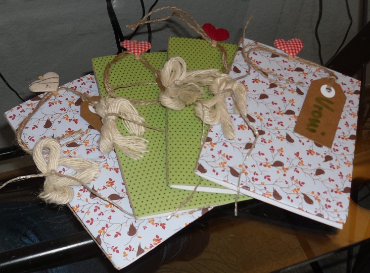 Die Namenskärtchen habe ich auf braune Anhänger-Kärtchen geschrieben, die mit winzigen Wäscheklammern mit kleinen Herzchen an der Menü-Karte befestigt wurden.