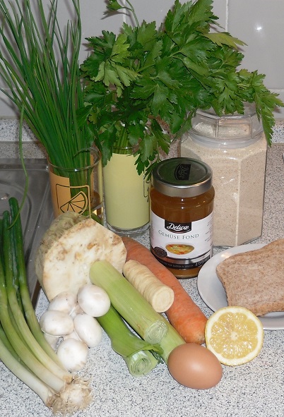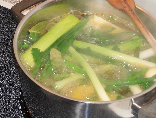 Das Suppengemüse mit Knoblauch, Lorbeer und dem halben Bund Frühlingszwiebeln, etwas Petersilie in dem Gemüsefond und einem Liter Wasser mit einem Teelöffel Salz aufkochen. Etwa eine Stunde köcheln lassen.