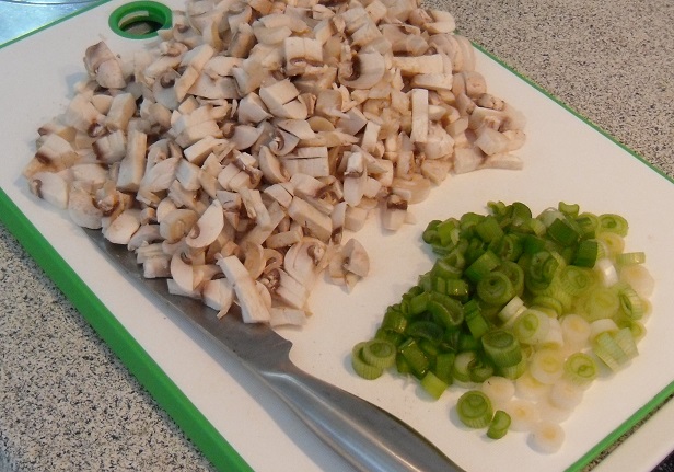 In einer heißen Pfanne die Margarine zergehen lassen und die Frühlingszwiebeln darin anbraten, bis sie glasig werden.