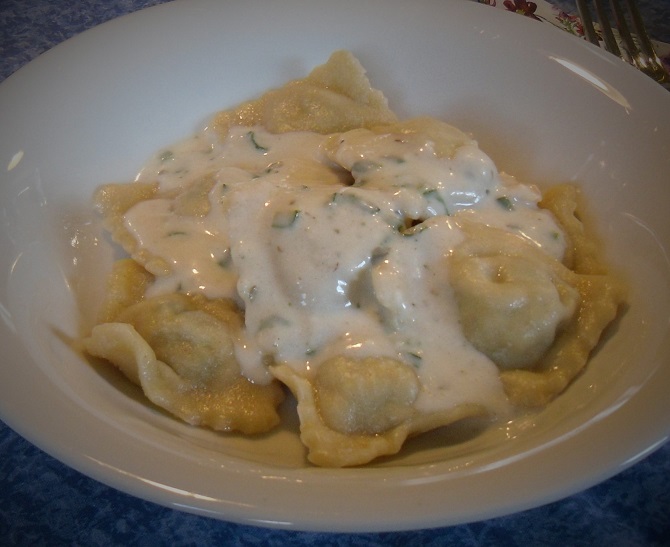 Die fertigen Ravioli auf einem, mit Weizengrieß bestäubten Brett oder Teller ablegen. Wenn man sie stapeln möchte, sollte man die bereits abgelegten Ravioli ebenfalls mit Grieß bestreuen. Dann kleben sie nicht zusammen