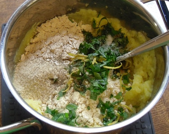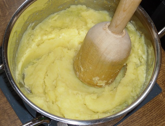 Die Kartoffeln noch heiß mit dem Kartoffelstampfer oder einer Kartoffelpresse bearbeiten, bis ein dickes Püree entsteht.
