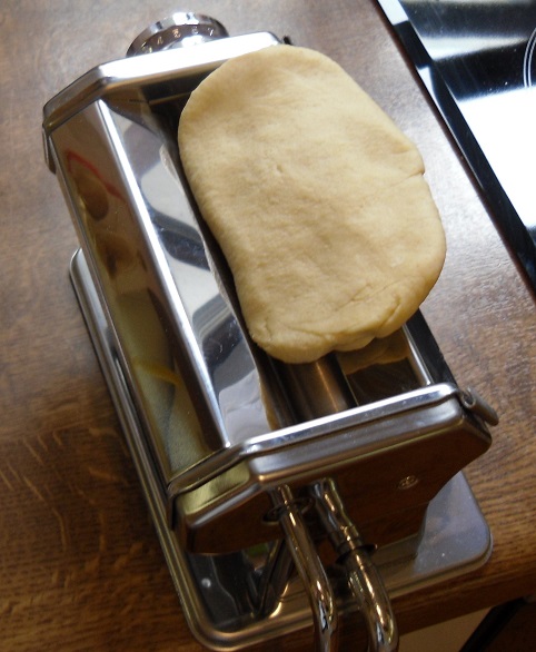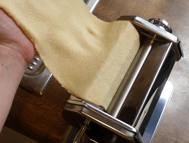 Den Nudelteig in kleinere Portionen teilen. Jede Portion mehrmals mit einer Nudelmaschine oder mit der Teigrolle auswalzen. Der Teig sollte jeweils etwa 1 mm dünn sein.