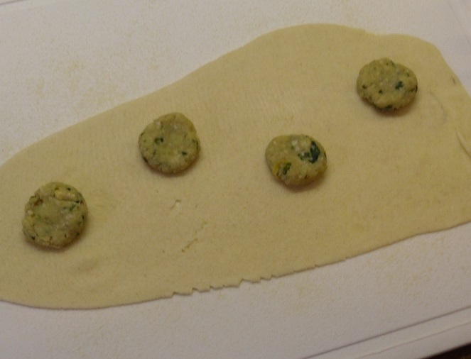 Auf dem Nudelteig im Abstand von ca. 4 Zentimetern jeweils einen Teelöffel der Füllung geben.