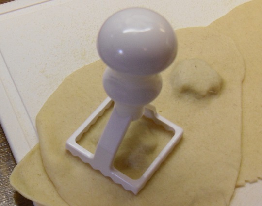 Zwischen den Füllungen zu ca. 5 x 5 cm großen Ravioli mit einem Messer oder einem Rädchen schneiden. Alternativ kann man auch, wie ich, eine Raviolistanze verwenden.