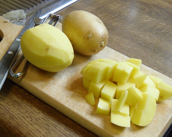 Die Kartoffeln waschen, schälen und in 2 Zentimeter große Würfel schneiden.