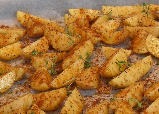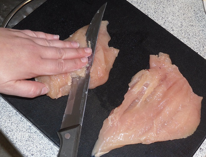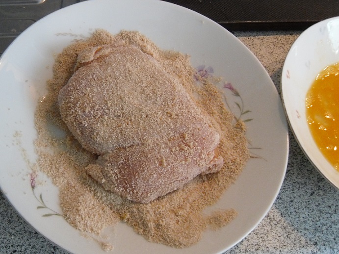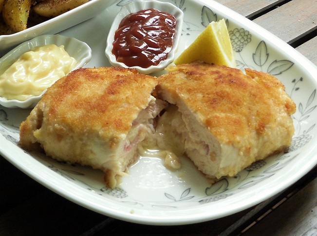 … für die Potatoes: 400 g kleine Kartoffeln … für das Cordon Bleu 2 Hähnchenbrüste von der Maispoularde Country PotatoesDie Kartoffeln waschen und mit einer Gemüsebürste gründlich reinigen. Die Kartoffeln je nach Größe vierteln bis achteln, so dass Spalten entstehen. Die Spalten in Olivenöl wenden, auf ein mit Backpapier ausgelegtes Blech verteilen und würzen. Bei dem Cayenne Pfeffer kommt es darauf an, wie pikant man die Kartoffeln haben möchte. Ich verwende für die Menge Kartoffeln etwa einen ¾ Teelöffel. Bei dem Paprikapulver kann man großzügiger sein. Zum Schluss den Thymian darüber streuen. Bei 200° Grad Celsius garen die Potatoes im vorgeheizten Backofen etwa 25 Minuten. Wenn sie noch nicht komplett knusprig aussehen, kann man die Garzeit noch um 5 Minuten verlängern. Cordon BleuDie Hähnchenbrüste kalt abspülen und mit Küchenkrepp trocken tupfen. Die Brüstchen auf ein sauberes Brett legen und mit zwei entgegengesetzten Schnitten in beide Richtungen aufschneiden, so dass man die Seiten dann aufklappen kann. Das Fleisch etwas flachdrücken. Die Hähnchenbrüste salzen und pfeffern. Den Schinken und Käse auf das Fleisch legen. Die Poulardenstücke zuklappen, so dass Schinken und Käse möglichst vom Fleisch bedeckt sind. Das Ei in einem tiefen Teller mit Salz und Pfeffer würzen und mit einer Gabel schaumig rühren. In einen zweiten Teller die Semmelbrösel schütten. Die Cordon Bleus nacheinander erst in Ei und dann in den Semmelbröseln wenden. Die restlichen Semmelbrösel verrühre ich immer mit dem Ei und brate sie später an. Damit muss man nichts verschwenden. Butter oder Margarine in einer Pfanne zergehen lassen. Die Schnitzel auf jeder Seite bei mittlerer Temperatur ca. 8-10 Minuten anbraten. Dabei decke ich sie gerne mit einem Topfdeckel ab. Dadurch geht man sicher, dass das Fleisch komplett durchgart. |