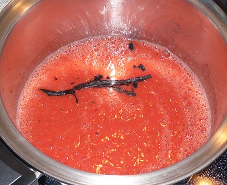 Die Vanilleschote wird eingeschnitten und das Mark herausgekratzt. Schote und Mark zu dem Püree in den Topf geben.