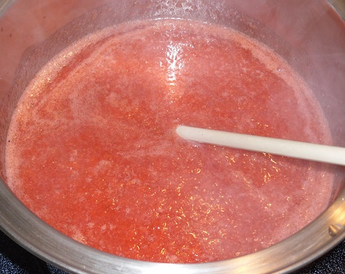 Die Masse zum Kochen bringen und stetig rühren, damit nichts anbrennt. Sobald das Püree sprudelnd kocht und nach oben steigt, lässt man sie 4 Minuten kochen. Dabei weiter rühren.
