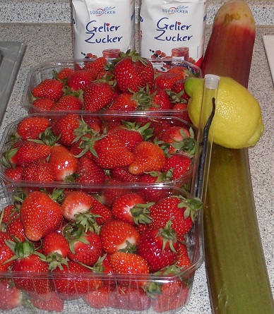 Erdbeeren und Rhabarber in einen großen Topf geben. Am besten ist es, wenn der Topf nur halbvoll ist, da die Marmelade hochkocht.