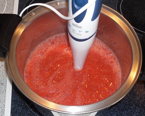 Mit einem Pürierstab Erdbeeren und Rhabarber zerkleinern. Wenn man die Marmelade etwas stückelig mag, dann püriert man die Früchte nicht vollständig.