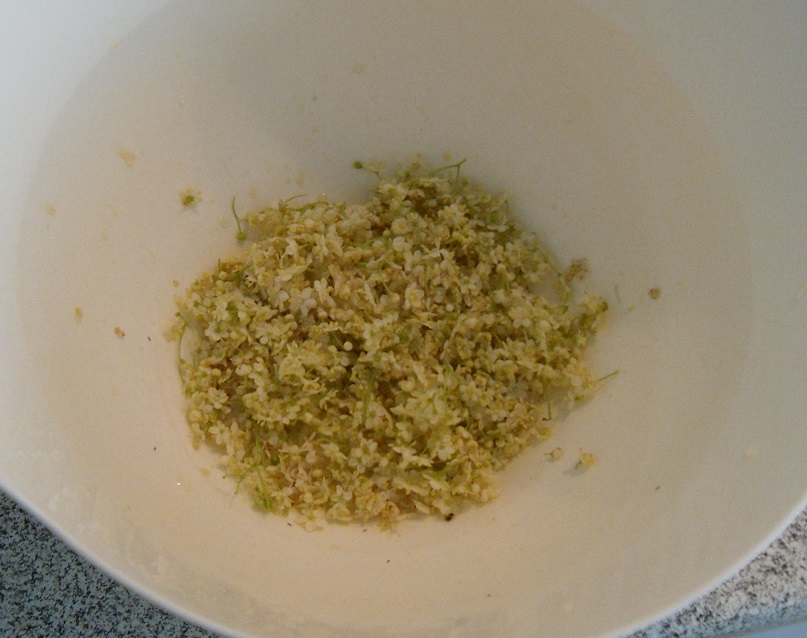 Die gewaschenen Holunderblüten in eine Rührschüssel zupfen. Es sollten möglichst wenig grüne Stängel mehr an den Blüten dran sein.