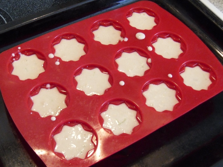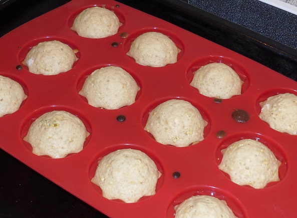 Den Teig gleichmäßig in die Formen verteilen. Nicht irritieren lassen – der Teig ist relativ flüssig und erinnert ein wenig an Pfannkuchen-Teig. Das ist korrekt und beabsichtigt, da der Teig kein zusätzliches Fett enthält.