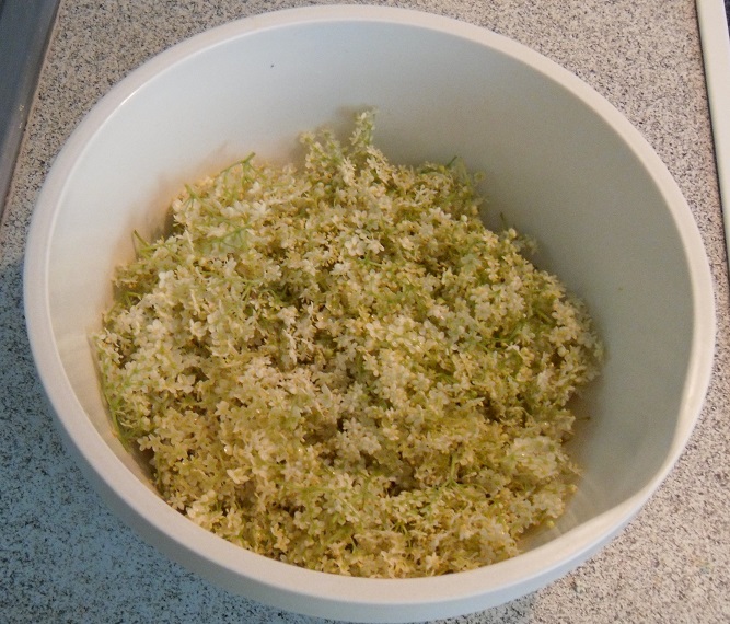Bei uns am Waldrand wachsen sehr viele Holunderbüsche. Dort bin ich sammeln gegangen und habe von vielen Büschen immer ein kleines bisschen abgeschnitten.