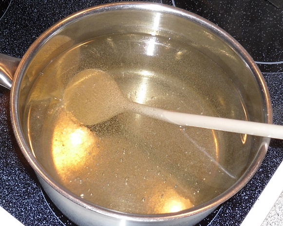 Den Zucker (und ggf. Zitronensäure) in einem Topf mit dem Wasser verrühren.