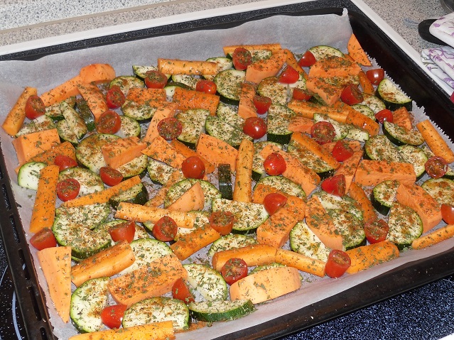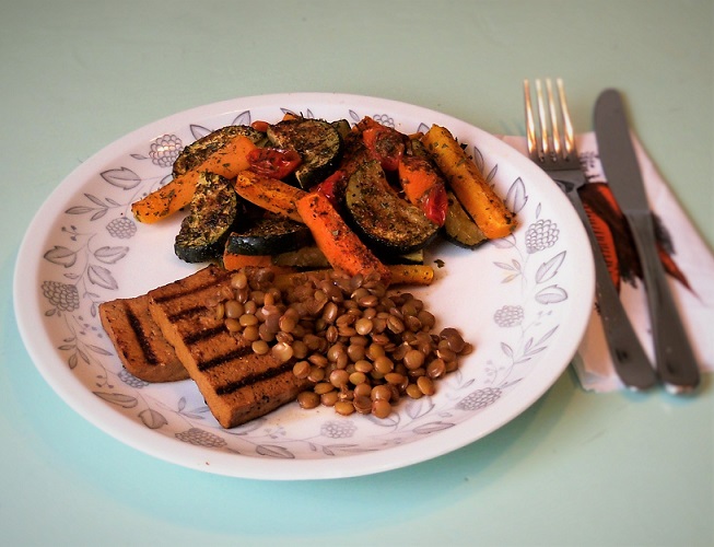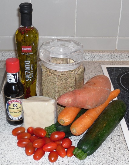 ZubereitungAm besten weicht man als erstes die Linsen ein. Das muss nicht unbedingt sein, allerdings verkürzt sich dadurch die Garzeit etwas und meiner Erfahrung nach werden sie auch weicher. Also Linsen mindestens zwei Stunden, bevor es mit dem Kochen losgeht, in etwa einem halben Liter Wasser einweichen. Den Tofu kann man zeitgleich vorbereiten, dann kann er schön in der Marinade durchziehen. Man kann übrigens beides auch schon am Vortag erledigen – dann sollte der marinierte Tofu mit Klarsichtfolie abgedeckt im Kühlschrank aufbewahrt werden. Für die Marinade vermischt man den Saft einer Zitrone mit 3 Esslöffeln Sojasauce, zwei Teelöffeln Agavendicksaft und einer schönen Prise frisch gemahlenem Pfeffer. Wenn es nun tatsächlich mit dem Kochen losgeht, schnippelt man als erstes die gewaschenen und geputzten Gemüse in grobe Stücke. Sie können gerne zwei bis drei Zentimeter Größe haben. Das Gemüse auf einem mit Backpapier ausgelegtem Blech gleichmäßig verteilen. Mit Salz, Pfeffer und den Kräutern würzen. Je nachdem, wie scharf man es mag oder verträgt kann man mehr oder weniger Cayennepfeffer darüber streuen. Das Ofengemüse mit Olivenöl beträufeln. Ich habe dafür ein Chili-Kräuter-Öl verwendet – welches ich aus meinem letzten Italien-Urlaub mitgebracht habe. Aber auch hier kann man variieren, je nach Geschmack und Schärfegrad. Das Gemüse kommt bei 200° Grad Celsius für 45 Minuten in den vorgeheizten Backofen. Wenn man es gerne etwas krosser und knuspriger mag, dann kann die Garzeit auch auf 60 Minuten verlängert werden. Sobald das Gemüse im Ofen ist, werden die Linsen abgegossen. Die Linsen in der Gemüsebrühe in einem kleinen Topf auf den Herd stellen und zum Kochen bringen. Anschließend die Temperatur soweit herunter drehen, dass sie gemäßigt 30 Minuten vor sich hinköcheln. Dabei regelmäßig umrühren. Etwa 10 Minuten, bevor Linsen und Gemüse fertig sind, wird eine Pfanne erhitzt. Ich verwende für den Tofu gerne eine Grillpfanne. Zum einen kann man damit auf die Zugabe von Fett verzichten und zum anderen bekommen die Filets dann so schöne Grillstreifen. 😉 Die Tofu-Scheiben von beiden Seiten scharf anbraten. Mit dem Rührbesen wird der Saucenbinder rasch unter die Linsen gerührt. Nun den Rest der Tofu-Marinade zusammen mit dem Balsamico-Essig unter die Linsen heben. Das Ofengemüse zusammen mit dem Tofu und den Linsen heiß servieren. |