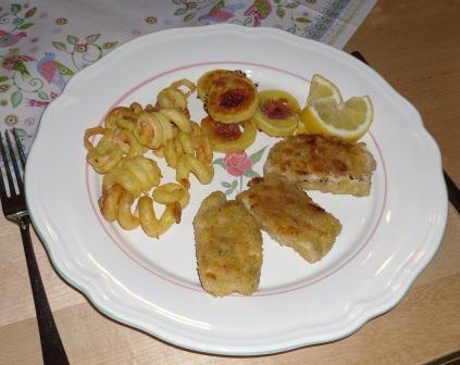Fischnuggets mit Kartoffelspiralen und Schinkentalern