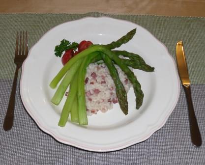 Grüner Spargel auf Schinken-Risotto
